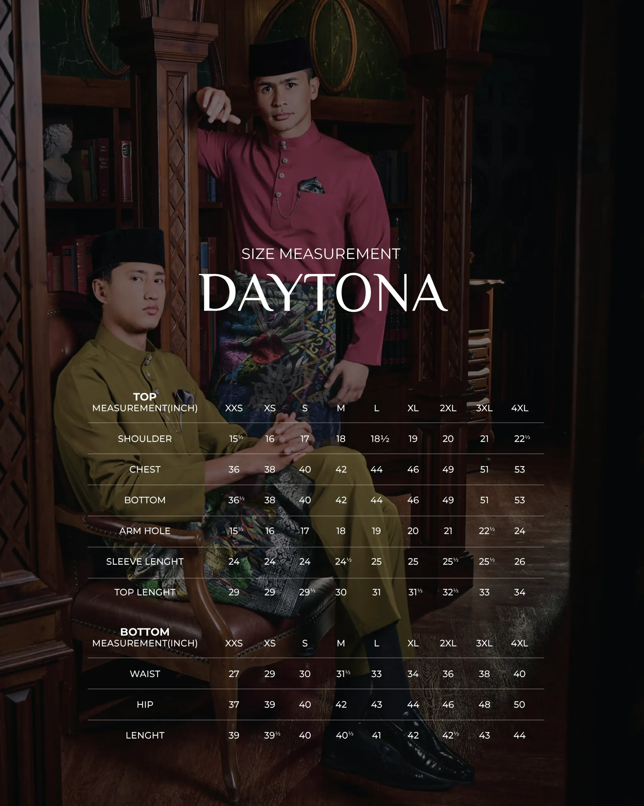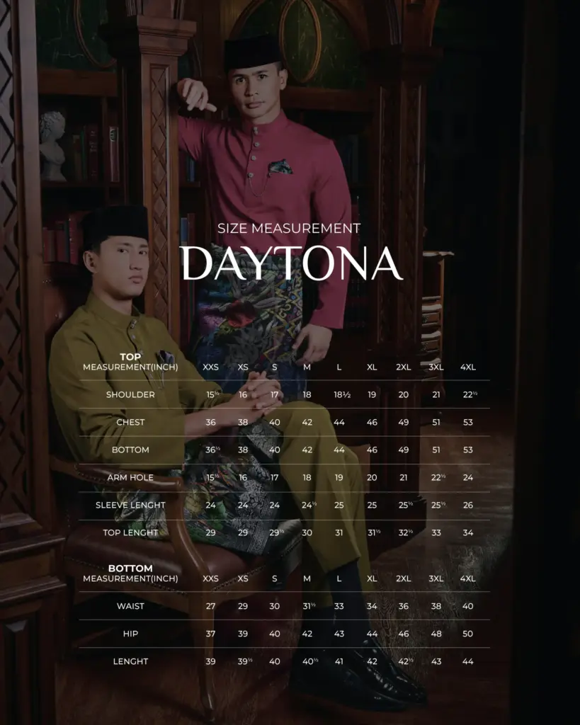 | Size Baju Melayu Daytona: No selection | XXS, XS, S, M, L, XL, XXL, 3XL, 4XL |